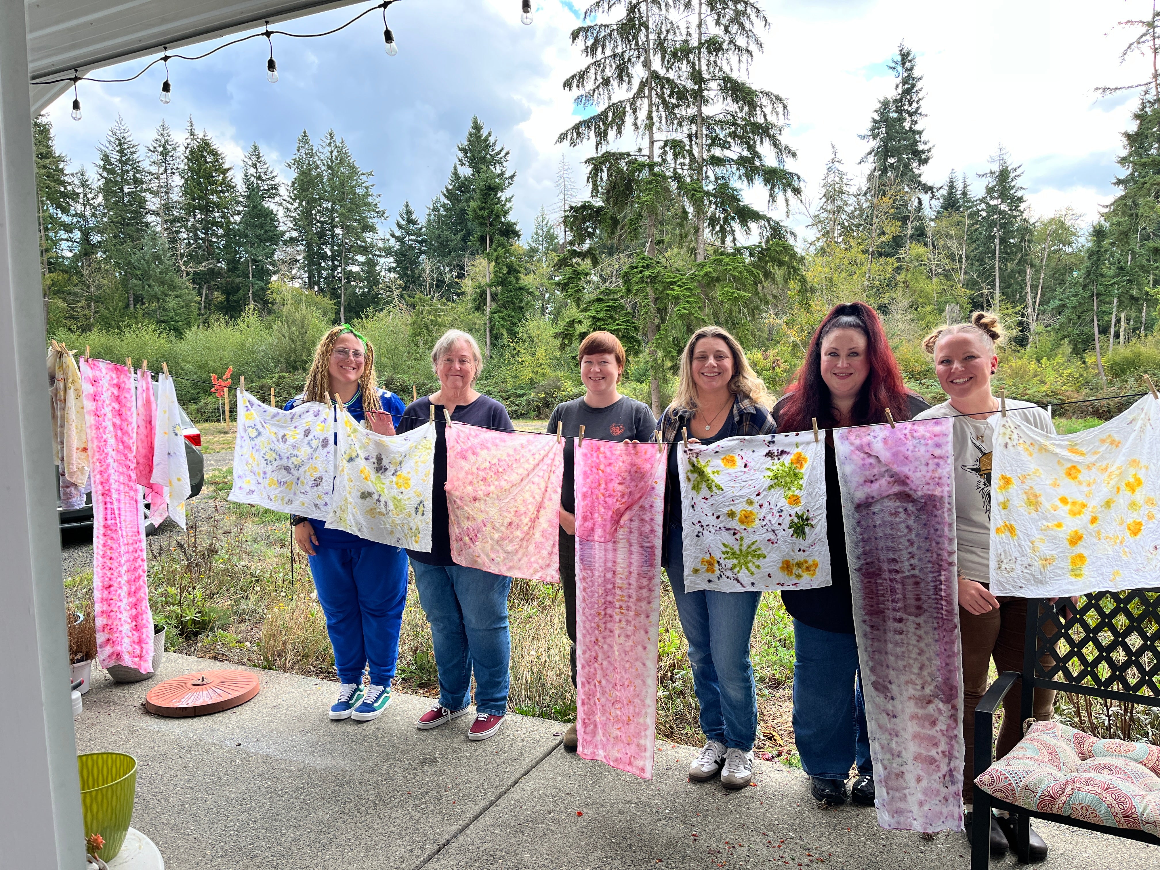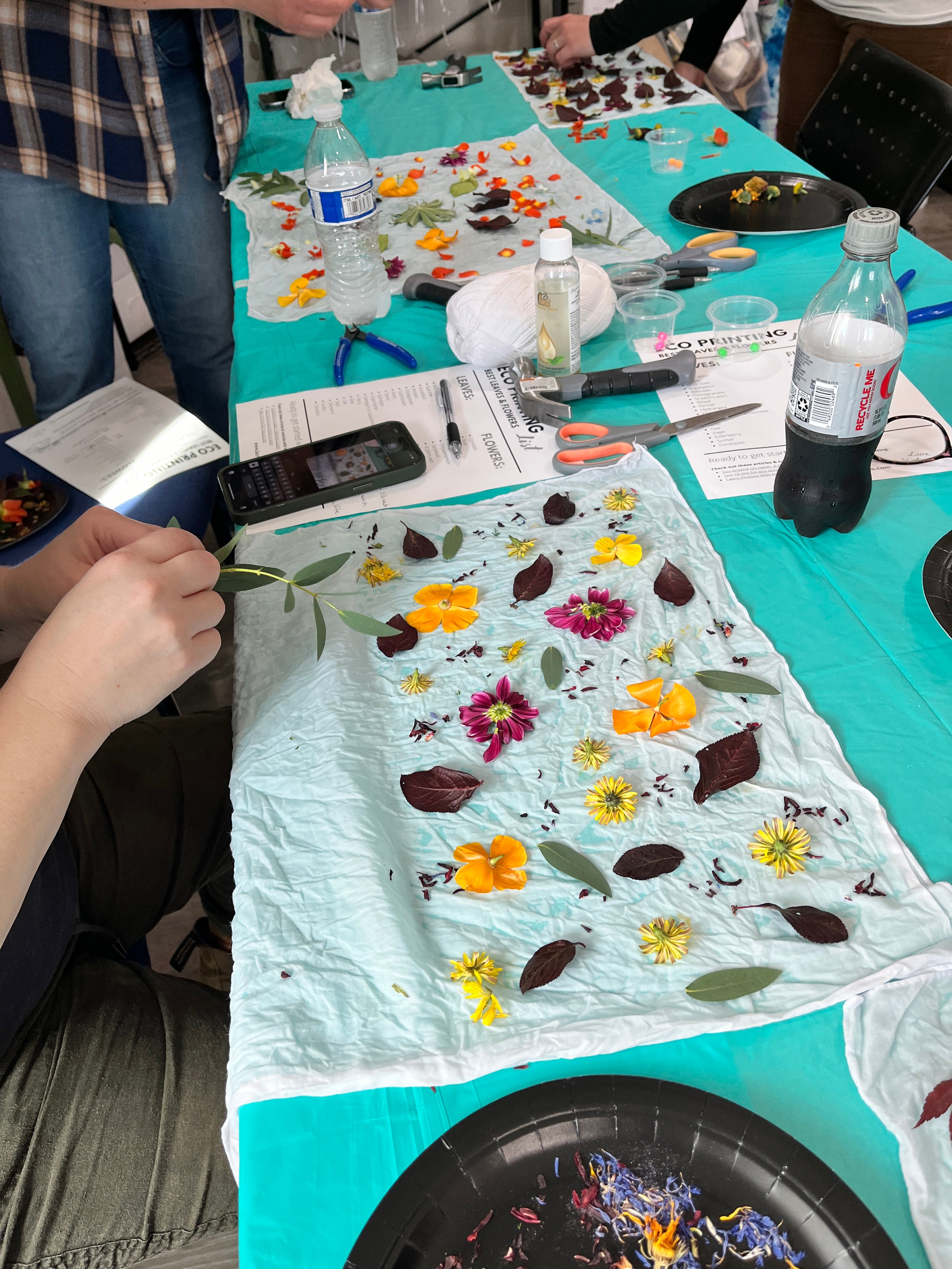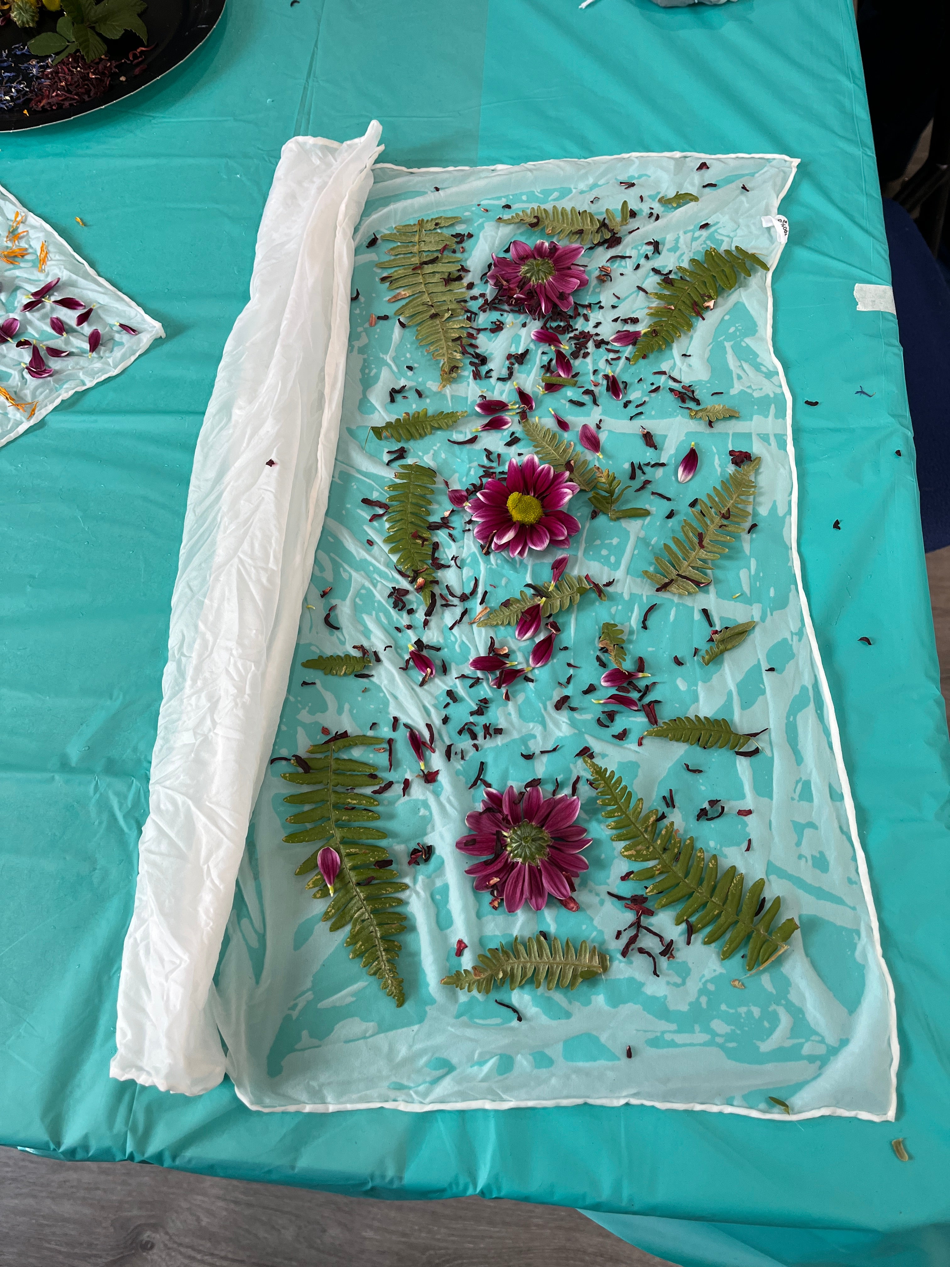 Discover the art of eco-printing in this hands-on class that covers both the bundle/steaming and pounding methods of transferring print to fabric. Using natural leaves and flowers, you'll create a beautiful long silk scarf along with a large cotton bandana. This DIY experience offers a relaxing way to connect with nature while crafting unique, wearable art. Perfect for beginners and those looking to explore sustainable dyeing techniques. All materials provided. Please do not bring fabrics of your own, as fabrics need to be prepped ahead of class time (but you'll learn what to do for future projects). You may bring your own fresh or dried botanicals, but you may be surprised that many don't transfer color as you'd expect!
