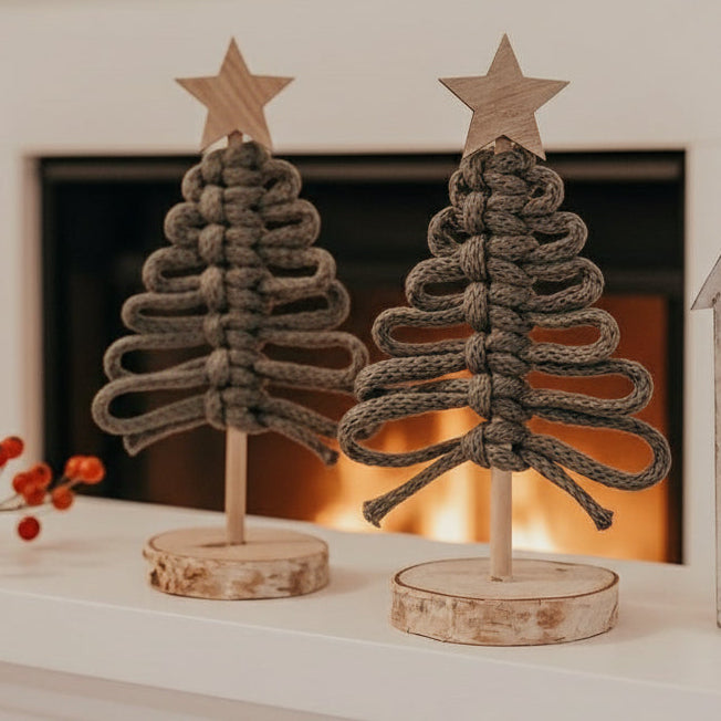 Learn simple macrame techniques while creating mini trees to use in your holiday decor. You'll learn several methods for tree-making while practicing beginner knots such as square, wrapping, half hitch and more. During class, you will have time to make 2 free-standing shelf sitters plus a few ornaments, or make all ornaments if you prefer. We'll have white, sky blue, red and green cord colors, plus wood beads, stars and other embellishments.